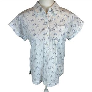 Vineyard Vines white shirt with blue sailboat print. Collared with half zip front. Size 6.