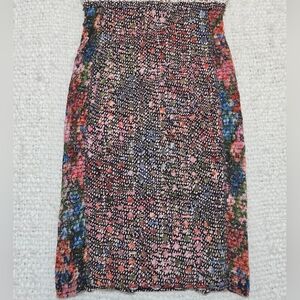 Skirt: A high-waist pencil skirt made of multi-colored floral fabric with circular cutout front and back panel overlay.