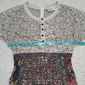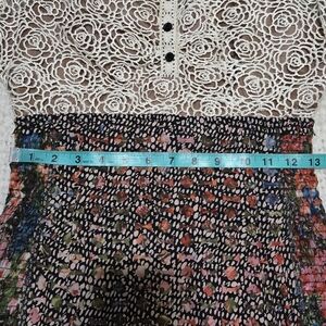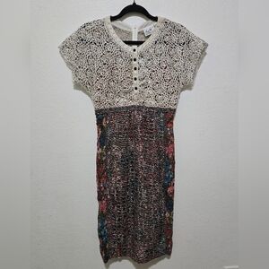 This stunning mixed-media sheath style dress combines romantic textures with a modern, flattering silhouette. It features an ivory/cream floral crochet lace bodice with a bib-style button front and delicate cap sleeves. The high-waisted skirt is crafted from a vibrant multicolor floral with smocked side panels that provide stretch and a "painted-on" fit.