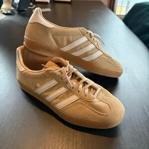 Adidas Gazelle in the Magic Beige color, with 3 white stripes and a gum rubber sole. Fun retro, timeless style. Very good to excellent condition.