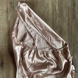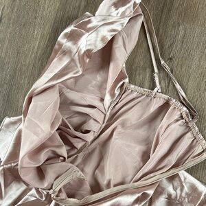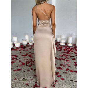 Unlined gown with a satin finish. High slit for dramatic flair and adjustable straps. Perfect for photos, only worn once for a photo shoot.