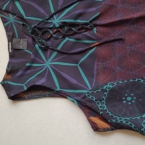 Geometrical print pattern If you are just assembling your wardrobe for the summer, be sure to buy the CARAS ERIKA blouse from the Desigual brand. Its thin, airy material and loose cut are a comfortable option for hot days. The lack of sleeves will emphasize the slimness of the arms and hands. The neckline with a tie gives sensuality and femininity. The asymmetric bottom and patterns in different colors emphasize the originality of the blouse, giving it an unusual and unique look.