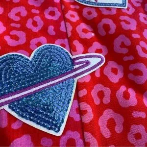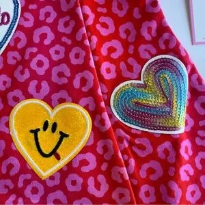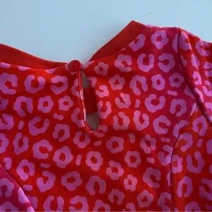 This dress features a vibrant red and pink animal print with a contract red trim and a keyhole button closure at the neck with 4 uniquely designed patches in bright vibrant colors.