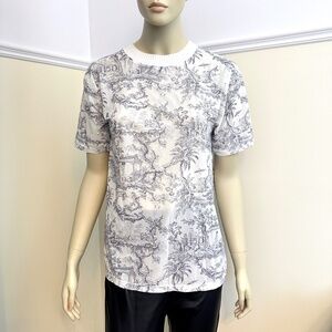This "Antoinette" t-shirt from the Austrian luxury brand Wolford features an all-over grey toile-style print on a white background.