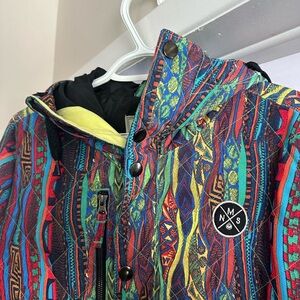 Stylish jacket with a vibrant multicolor design. Includes a hood and secure closures.