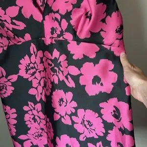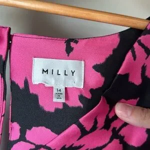 Elegant Milly dress size 14 featuring a bold pink floral print on a black background. Designed with a flattering V-neckline, sleeveless silhouette, and tailored waist for a chic, feminine fit. Perfect as a cocktail dress, wedding guest dress, date night outfit, or special occasion look.