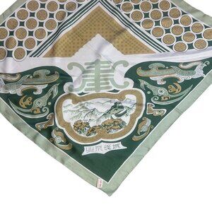 Vintage square scarf - Golds green and white with a landscape scene on one end. Below the scene it translate to Bejing