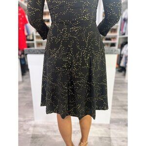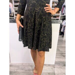 A beautiful and feminine dress from designer Hutch. Black with gold dots throughout. V-neck, half sleeves, back zipper closure. Perfect choice for any dressy event: wedding guest, date night, cocktails, semi-formal, and more!