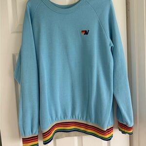 Light blue sweatshirt with vibrant rainbow accents. Casual and trendy style. (No pilling)