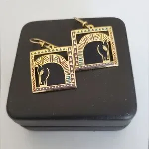 These Laurel Burch equine earrings feature a striking horse design in black and gold, with multicolor accents around the borders. Wear with anything! Signed/named by artist on back. EUC.