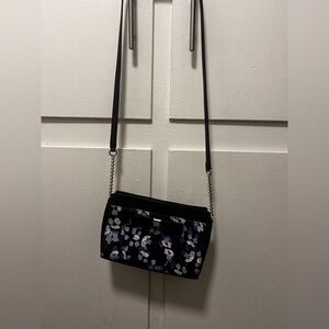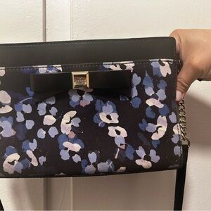 Elegant crossbody bag with floral pattern. Features a stylish bow accent. Ideal for any occasion.