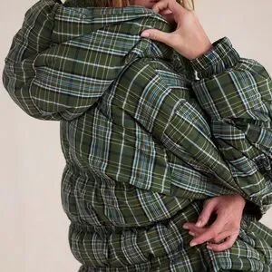 Stylish plaid puffer with a warm, cozy feel. Perfect for chilly days.