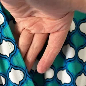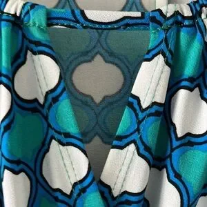 Laundry small capped dress. Wraparound look in front, small open design at the neckline. Elastic on the sleeves and around the neck. Size XL The colors are blue/ green/white.