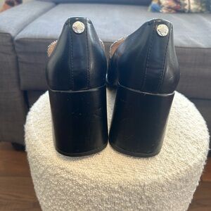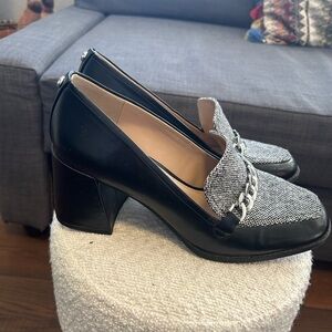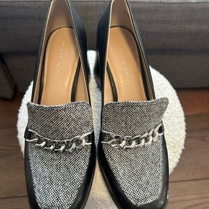 Tonnia Tweed Pump / Loafer Pump These shoes feature a black faux leather exterior with a distinctive black and white tweed (or plaid) fabric panel on the upper.