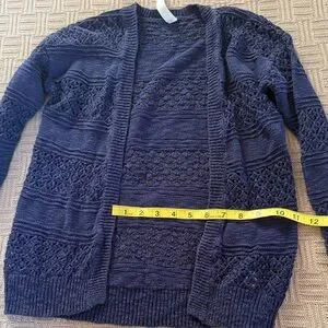 Elegant navy cardigan with intricate knit design. Perfect for layering.