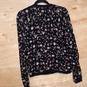 Stylish black jacket with floral design. Features a front zip. Ideal for layering.