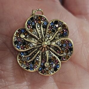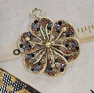 Elegant Gucci stamped gold-tone and multicolor floral pendant with sparkling crystal stones. Perfect for adding a touch of glamour to any outfit or bag!