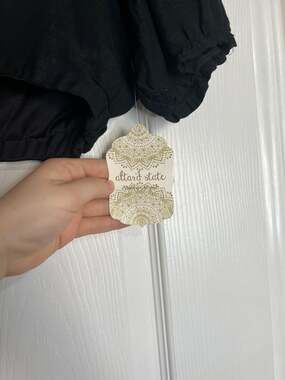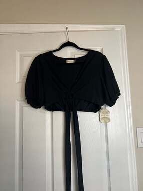 New with tags Altar'd State cropped blouse in a solid black color. This stylish top features a deep V-neckline with a unique O-ring center that leads into a long tie-front detail. It has voluminous puff sleeves with elastic cuffs and a cropped, elasticized hem for a flattering fit. Perfect for casual outings or dressing up for a night out. New condition with original retail tags attached.
