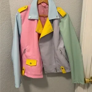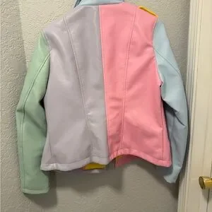 Vibrant biker jacket with pink, blue, green, and yellow patches. Stylish and bold design.
