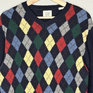 Vintage 90s GAP argyle wool sweater in classic navy with multicolor diamond pattern front. Iconic preppy ivy style knit with strong dad core and grandpacore aesthetic. Traditional V neck pullover silhouette with collegiate campus energy and timeless 90s menswear appeal. Features solid sleeves and bold argyle panel for classic old school prep look. Authentic 90s GAP era knitwear staple.