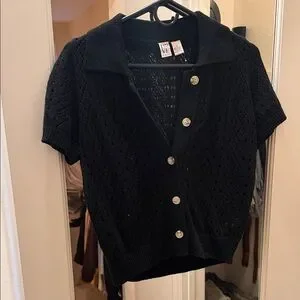 Chic black cardigan with button-up front. Short sleeves and textured knit. Versatile and stylish.