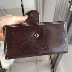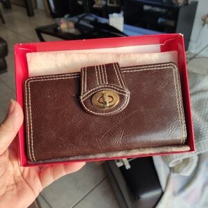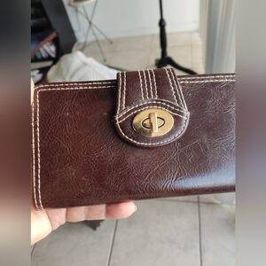 Stylish brown leather wallet featuring a turn lock closure. Perfect for organizing essentials.