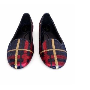 Coach Deborah Sequin Plaid Ballet Flats Sz.6. These feature a classic ballet silhouette embellished with red and navy blue tarten plaid pattern made of shimmering sequins. Leather upper, leather lining and a padded leather insoles for comfort. These are in excellent condition,the only flaw is scuffing on the bottoms of the shoes.