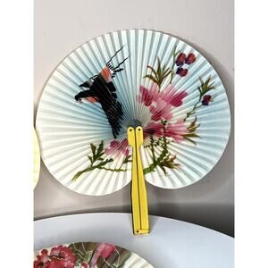 Vintage 1949-1960 PRC Set of 3 Paper Hand Fans Folding Bird Flowers Metal Handle