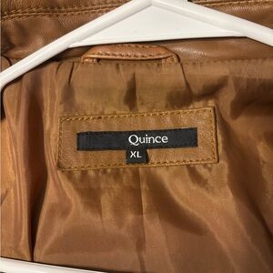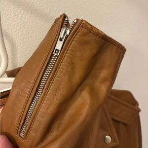 Stylish tan leather jacket with a classic moto design. Features zippered pockets and a belted waist.