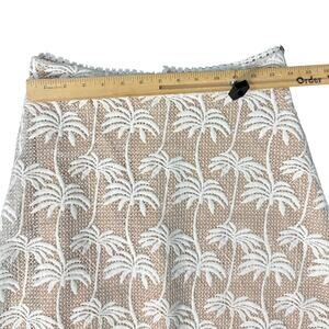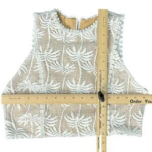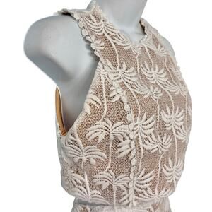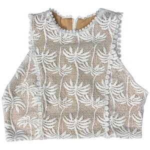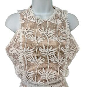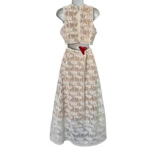 Two piece lace set with embroidered tropical palm motifs in off white over a nude lining for contrast. Sleeveless high neck top includes built in cups, while the high waisted midi skirt features a flared shape and lace hem, both finished with metal back zippers and guipure lace trim. Made from 100% polyester with 100% polyester lining, originally retailed for $250. Ships within 2 business days. All sales final.