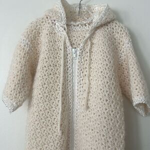 handmade, crocheted or knitted baby romper or bunting suit. These items are typically made from soft yarn for warmth and comfort, featuring a hooded design and a front zipper closure for easy dressing.