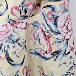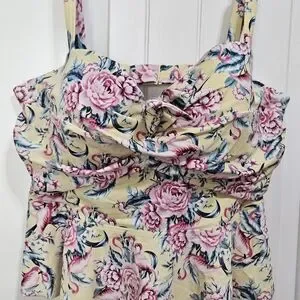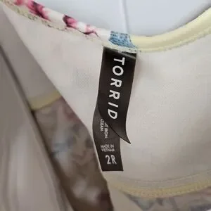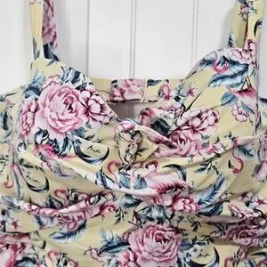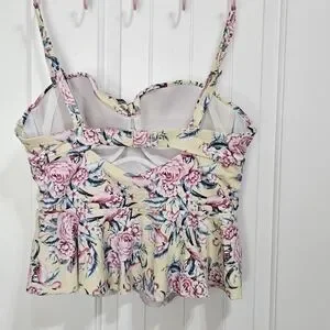 Torrid Vixen Flamingo and floral print long bikini top. Has underwire, padded cups, and adjustable straps and back. Great pastel whimsical pattern. Ruffled peplum bottom and twist detail on front.