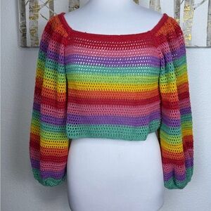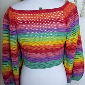 Vibrant striped sweater. Features red, yellow, green, and blue. Crew neck design. Perfect for a bold look.