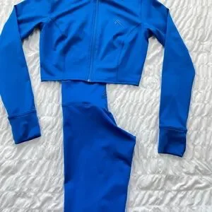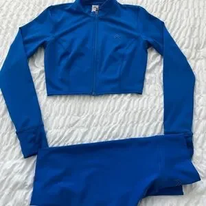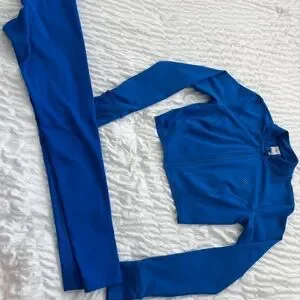 Elevate your activewear with this vibrant blue long sleeve crop top with high waisted pants. Perfect for workouts or casual wear, it offers both style and comfort.