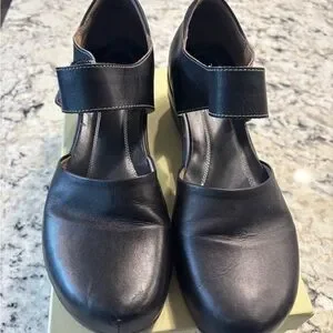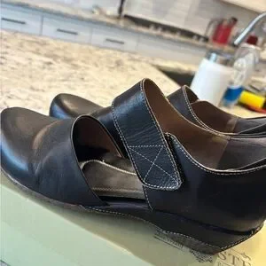 L’Artiste Gloss black leather wedges with Velcro ankle strap. Very gently worn. Size 11 or 42. Stored in their box. Box included.