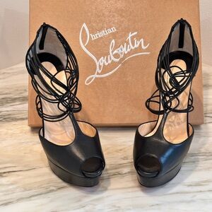 Chic black peep-toe heels with unique strap design. Elevate your style effortlessly. Comes with the original box, dust bag.