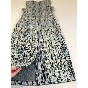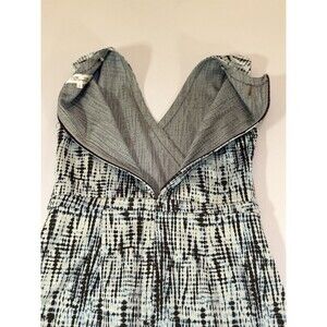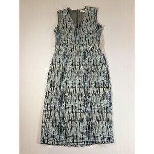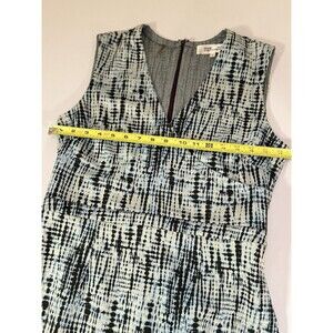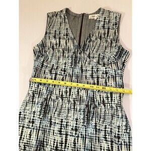 Beautiful Diane Von Furstenberg sleeveless sheath dress in a modern blue, black, and ivory abstract print. This structured piece features a flattering V-neckline, fitted waist, and back zip closure with a deep plum zipper detail. The fabric has a substantial feel with light stretch, creating a polished silhouette that works perfectly for office, business events, or elevated daytime wear.
