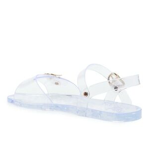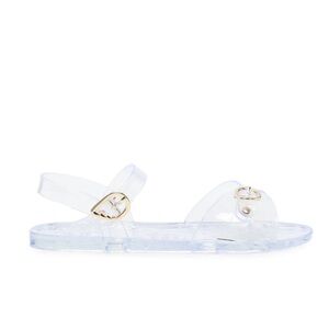 These "jelly" sandals are inspired by '90s nostalgia and are crafted from transparent, recycled PVC. They feature signature gold-tone wing-shaped buckles, an open almond toe, and a textured sole for grip.