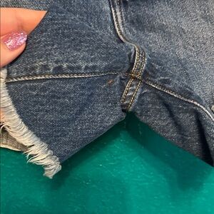 Trendy distressed jean shorts. Classic blue denim. Perfect for casual wear.