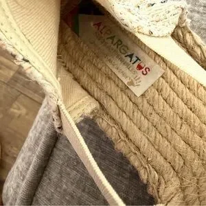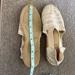Step into comfort and style with these chic, color cream, blue, brown with a touch of gold threads, artesania espadrille flats. Ideal for casual outings. Pre-loved, size 39 (8 1/2). Does have adjustable elastic straps.. This item does not have its original box. Offers Welcome..