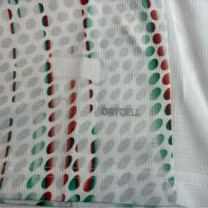 White jersey with green and red dot pattern. Puma logo on the front.
