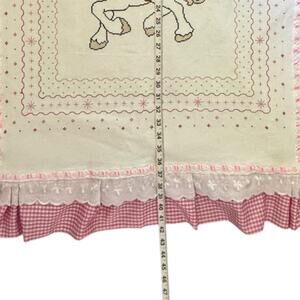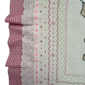 Handmade Strawberry Shortcake with horse cross stitch baby blanket. Outlined by with lace/pink ribbon and pink gingham fabric. Quilted on the other side.
