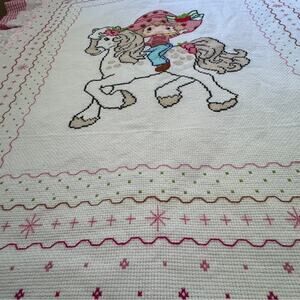 Strawberry Shortcake Cross Stitch Handmade Baby Quilt Blanket 34”x 42”