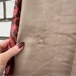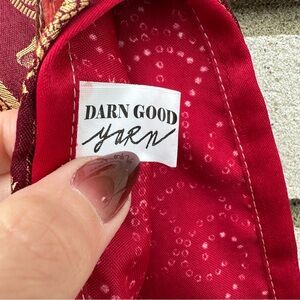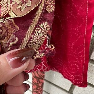 Darn Good Yarn reversible silk wrap mini skirt featuring a vibrant patchwork design with rich magenta, pink, burgundy, red, and gold brocade panels. Handmade from reclaimed sari silk, this wrap silhouette offers a flattering adjustable fit and unique one-of-a-kind textile patterns on both sides. Length: Mini. Waist: Regular (4–12 adjustable wrap fit). Features intricate jacquard brocade, floral motifs, and contrasting prints for versatile styling. Condition is good used with thread snags and minor flaws typical of delicate recycled sari silk; one larger snag is present on the less patterned beige side as shown. These characteristics are common to the material and do not affect wearability, adding to the authentic handmade character.