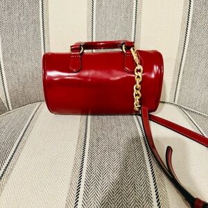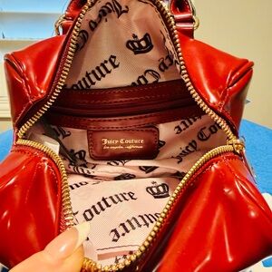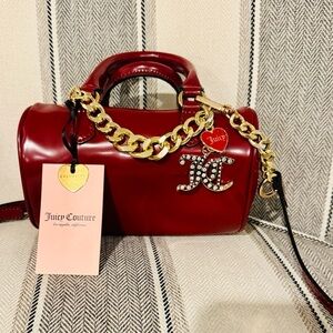 Glossy red mini bag by Juicy Couture. Features a bold gold chain and signature charm. Perfect for adding flair to any outfit.