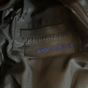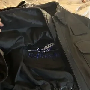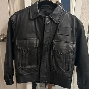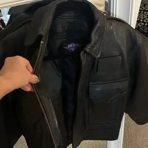 Classic black leather bomber jacket by Chaps. Features front pockets and a sleek design. Ideal for versatile styling.