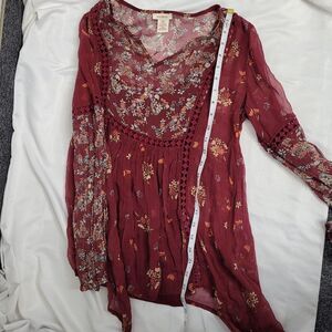 Floral print Woodrose sheer long sleeve top with cami tank attached underneath by Sundance. Great with jeans for a casual look. Crinkle chiffon. Rayon. Loose fit.