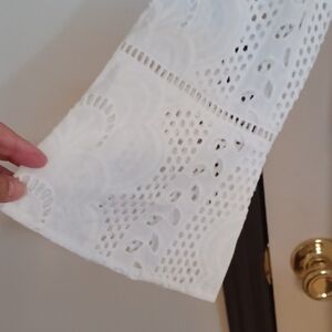 Leslie Fay white eyelit dress with slight bell 3/4 sleeve. 3 decorative front buttons, rear zipper, fully lined. Lovely dress in excellent condition size 10.