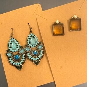 These are two pairs of lovely, romantic Bohemian vintage style earrings - one has a chandelier shape and features various blue beads. It measures 1.6" in length. The other pair are studs with square faceted amber gold beads and a small accent crystal at the top. They measure .6" in size. Both are in strong preloved condition.