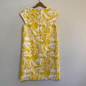 This Kate Spade women's sheath dress in size 4 is a stylish and elegant choice for any career or preppy occasion. Made from cotton with a woven fabric type, this knee-length dress features a round neck, sleeveless design, and zip closure at the back. The dress is lined for added comfort and comes in a vibrant yellow color, perfect for spring and summer. With its classic sheath style and subtle zipper accents, this dress is a versatile and chic addition to any woman's wardrobe.